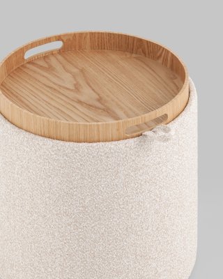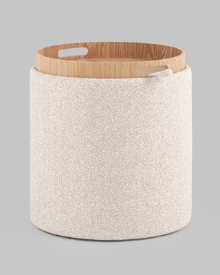 Мягкий пуф с ящиком станет незаменимым украшением интерьера. Он не только удобный, но и функциональный. Благодаря двухсторонней крышке, пуф можно трансформировать в журнальный столик. Столешница выполнена из светлого дерева с бортиками по краям и вырезными ручками для удобства, и безопасности при использовании. Крышка пуфика полностью съемная и при необходимости её можно использовать как поднос. Полезное дополнение - ящик для хранения различных мелочей, внутри обит тканью. Компактный и вместительный, такой пуфик наполнит пространство особым уютом и теплом. Подойдет для любого интерьера - как в классическом стиле, так и в современном.