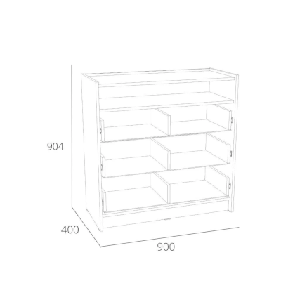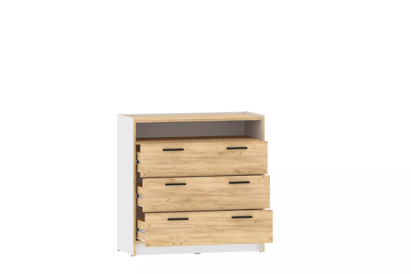 Комод оснащен четырьмя выдвижными ящиками, которые открываются плавно и бесшумно за счет шариковых направляющих, открытой нишей для удобного хранения вещей, а также представлен в двух размерах, чтобы точно уместиться в параметры вашей комнаты. Черные ручки комода гармонично контрастируют с песочным оттенком фасада.