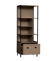 Корпус стеллажа выполнен из ЛДСП и металлического профиля. Металлическая ручка-ракушка с матовой поверхностью проста в установке, надежна и удобна в использовании, и к тому же, имеет прекрасный внешний вид. Фасады вкладные с рамочным профилем собственного производства. Опоры стеллажа визуально неотличимы от металлических, но выполнены из пластика, что облегчает вес модуля в целом.