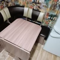 Кухонный стол со складной половиной столешницы в цвет корпуса углового кухонного дивана.