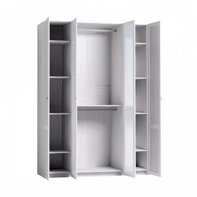 Вместительный четырехдверный Шкаф для одежды и белья с зеркалами во весь рост – уже зарекомендовал себя как отличный, продуманный по внутреннему наполнению и функционалу модуль. Глухие фасады шкафа декорированы раскладкой, центральные зеркальные рамочные фасады без раскладки. Боковые отсеки комплектуются 4 полочками, которые легко закрепить на нужной высоте. Две стационарные штанги в центральной части шкафа также можно перевешивать: для двух штанг предусмотрены три варианта присадки. Это поможет рассортировать длинную и короткую одежду на плечиках. Возможность перевешивать двери позволят создать современную компоновку из нескольких шкафов во всю стену - альтернативу шкафам-купе.