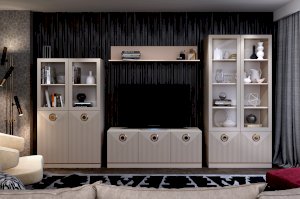 В конструкции модуля верхняя часть со стеклодверками с прозрачным стеклом создана для красивых предметов, сувениров и памятных фото. А внизу за глухими фасадами расположены две ниши, разделенные полками для закрытого хранения вещей.