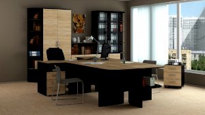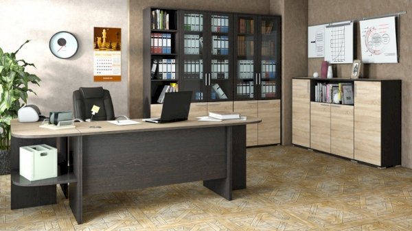 Стильная эргономичная мебель из модульной серии «Успех-2» оформлена в респектабельно-эффектном сочетании контрастных оттенков натуральной древесины: тёмного «Венге Цаво» и светлого «Дуб Сонома». В коллекцию входят столы, шкафы, стеллажи, тумбы разной конструкции и назначения, что позволяет подобрать оптимально отвечающую вашим требованиям меблировку для каждой комнаты офиса.