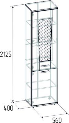 Шкаф для посуды Норвуд 13 - этот модуль создан для красивой посуды, хрупких сувениров. Высокий и узкий шкаф-пенал будет уместен в гостиной любых размеров. Фигурный фасад верхней витрины эффектно совмещает в себе тонированное стекло, ЛДСП и контрастную вставку в цвете Орех Шоколадный. Стеклянные полки из прозрачного стекла толщиной 6 мм. Благодаря модулю Подсветка ADELE 87, которую можно докупить отдельно, теплый свет будет приятно подсвечивать посуду в витрине. В нижнюю закрытую тумбу посудного шкафа можно убрать вещи, не предназначенные для посторонних глаз. Фасады шкафа перевешиваются на левую и правую сторону.