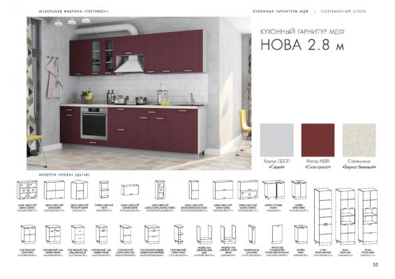 Кухня Нова изговаливается также в цветах серый/силк гранат; серый/силк тирамису; серый/силк алмонд; серый/крем-брюле + горький шоколад глянец. Модули в этих цветовых решениях вы сможете найти в нашем интернет-магазине.