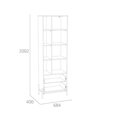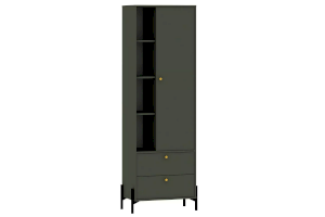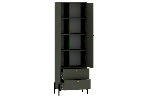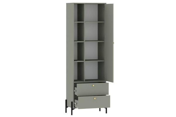 Шкаф оснащен распашной дверкой, которая закрывается мягко и легко за счет механизма с доводчиком, двумя выдвижными ящиками с системой шариковых направляющих, при помощи которых ящики выдвигаются бесшумно, а также открытыми полками. Благодаря комбинации закрытых и открытых ниш можно удобно разместить все необходимые книги и предметы интерьера, они не будут разбросаны в хаотичном порядке, а оригинальные высокие опоры обеспечивают быстрый и комфортный доступ при уборке. Дополните шкаф тумбой из одноименной коллекции, чтобы оптимизировать место хранения и создать особо гармоничную атмосферу.