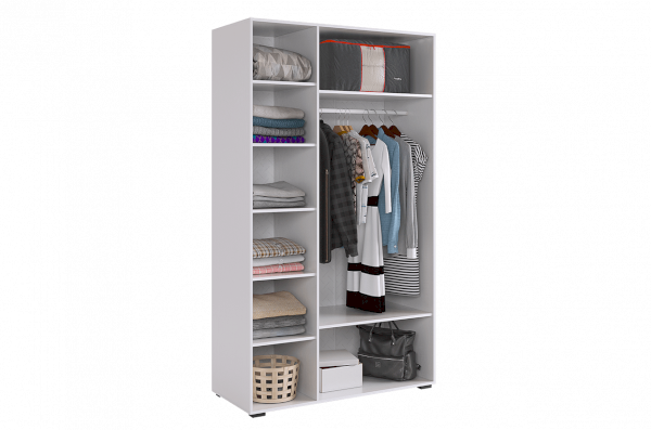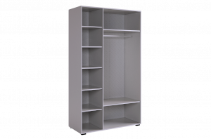 Внутреннее наполнение шкафа состоит из двух секций. Первая секция оснащена штангой и двумя полками, чтобы вы могли удобно разместить свою одежду. Вторая секция предлагает пять полок для хранения различных предметов. Важно отметить, что наше изделие обеспечивает бесшумное закрывание фасадов, что поможет Вам избежать неприятных звуков при использовании шкафа.