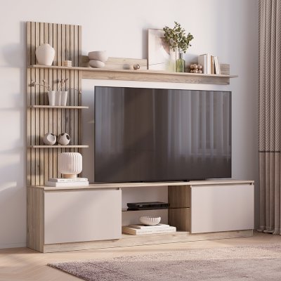 Гостиная "Рио" - это современная интерпретация классической гостиной. Данная модель достаточно компактна, но при этом является функциональной и вместительной. Гостиная "Рио" представляет собой единую конструкцию и вмещает в себя всё необходимое для компактного хранения - вместительная ниша под ТВ, открытые полки для домашней акустики и нужных вещей.