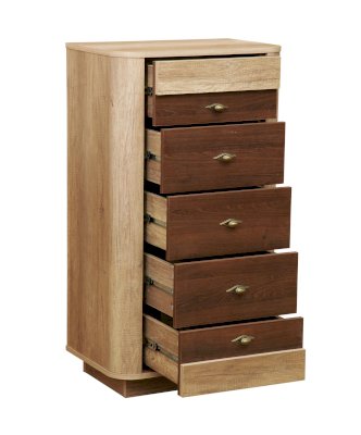 Модуль состоит из пяти выдвижных ящиков – под вещи, белье, трикотаж. Можно четко сегментировать зоны: в верхнем ящике хранить документы, в нижнем – обувь, а средние распределить под вещи, которые принято хранить отглаженными (например, постельное белье и полотенца) или сложенными (свитера, джинсы, водолазки).