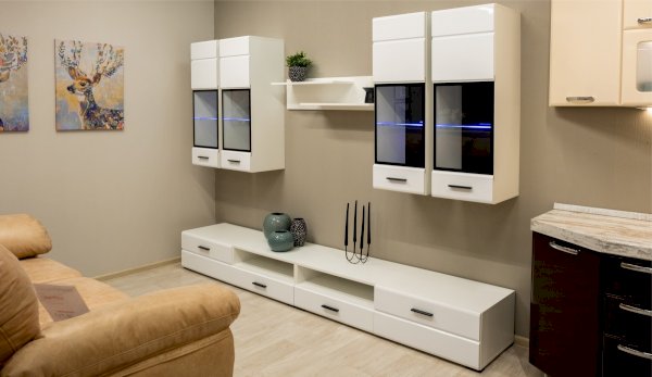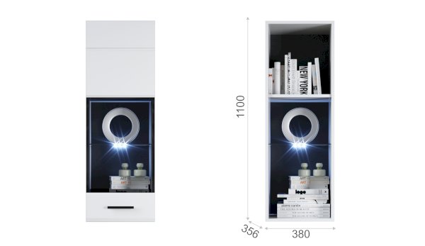 Белые глянцевые фасады МДФ и витрина с прозрачным стеклом сделают Вашу гостиную светлее и уютнее. Задняя стенка пенала-витрины Йорк черного цвета красиво контрастирует с фасадами и корпусом белого цвета. Светодиодная подсветка сделает акцент на дорогих для Вас вещах, таких как фото, статуэтки, сувениры. Регулируемые навесы, которыми оснащен пенал, позволят после подвешивания отрегулировать его положение. Пенал-витрина выполнена из экологически безопасных материалов.