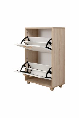 Ручки на створках выполнены из натурального массива дуба. Использование на створках псевдомагнитов позволяет сделать изделие комфортным в использовании.Ножки обувницы, выполнены из массива дерева, регулируются по высоте.