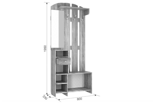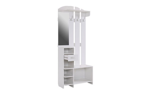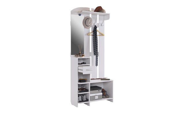 «Мила» создана для Вашей прихожей – Вы можете повесить одежду и сумку на металлические крючки, шляпки положить на полку сверху, нужные мелочи – в выдвижной ящик. На открытых полках можно разместить зонты, перчатки и шарфы. Есть зеркало и обувница.