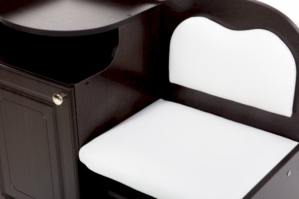 Банкетка выполнена в классическом стиле. Удобные полки и ящики добавляют ей функциональности.