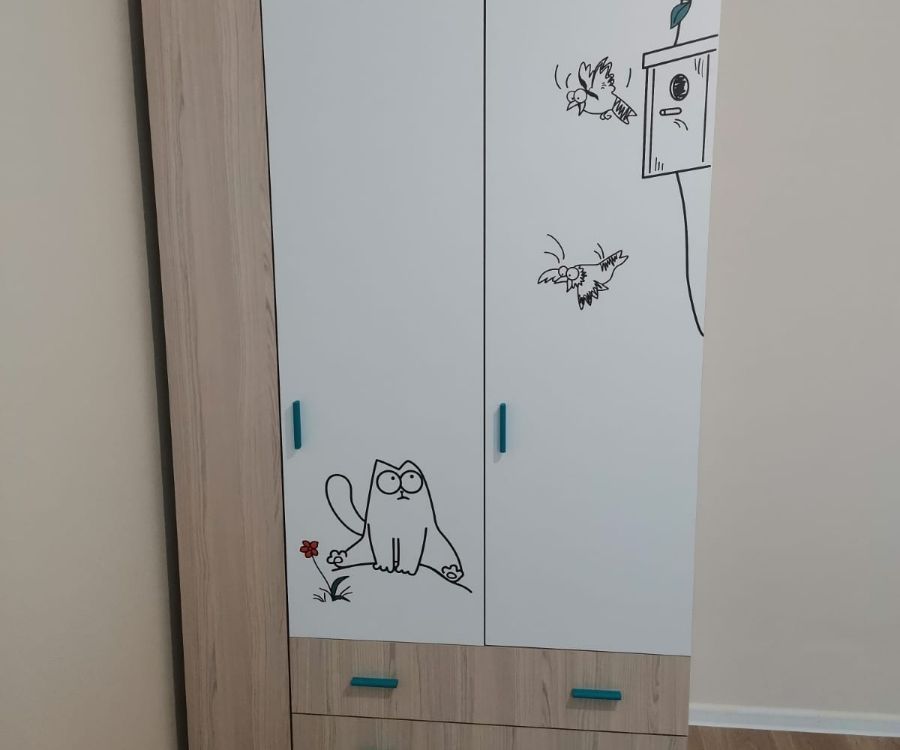 Наполнение: 2 выдвижных ящика на шариковых направляющих глубиной 450 мм, петли с доводчиком, штанга для одежды, полки.