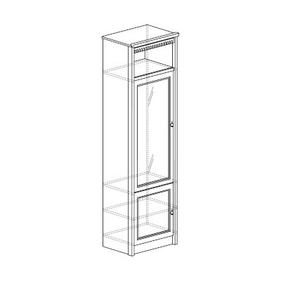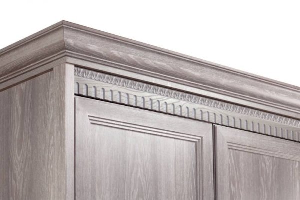 Фасады: МДФ, зеркало с фацетом, прозрачное стекло с фацетом и гравировкой; декоративные вставки с фигурной фрезеровкой: МДФ в пленке ПВХ с эффектом патины