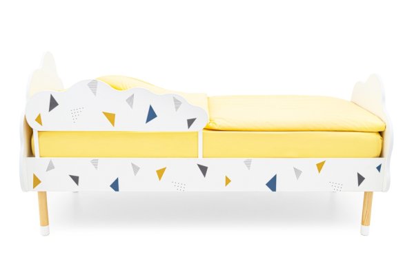Изголовье и изножье кроватки сделаны в виде облака. Высота от пола до самого высокого места составляет 66 см. Это позволяет даже маленькому ребенку комфортно забираться и спускаться с нее, не рискуя упасть. Специальная конструкция кровати позволяет с лёгкостью присесть или прилечь рядом взрослому, если ребенок не может заснуть.