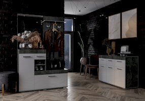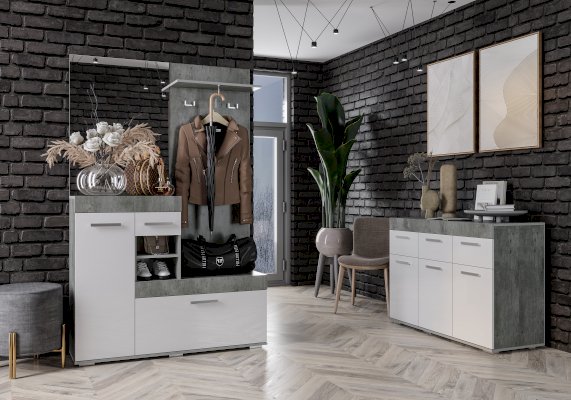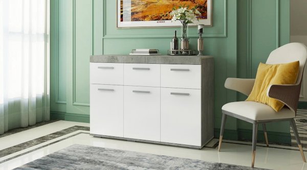 Светлые матовые фасады, стильный корпус в цвете бетон, лаконичные хромированные ручки – все это про модель комода Инстайл из одноимённой мебельной коллекции. Размеры комода позволяют разместить в нем большое количество вещей. В верхних выдвижных ящиках можно хранить украшения или аксессуары.