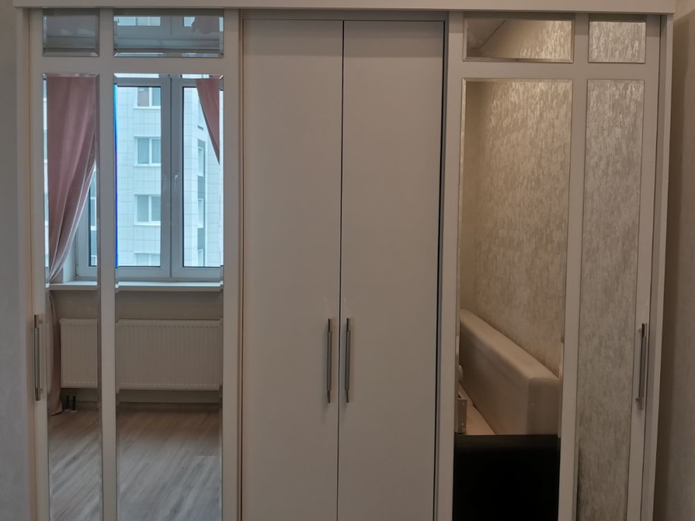 У раздвижных зеркальных дверей видна щель, если смотреть на шкаф с боку! Собрали согласно инструкции.