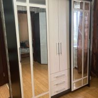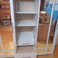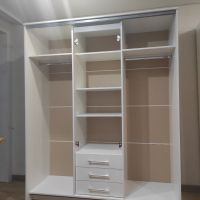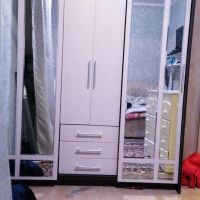 очень удобный многофункциональный шкаф купе с доп полками и выдвижными ящиками который ращделяется на три части что позволяет хранить вещи более удобнее