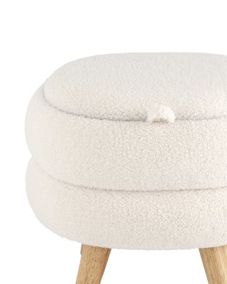 Круглый пуф Винни в скандинавском стиле. Обивка выполнена из ткани тедди - очень мягкий и приятный на ощупь материал. Прочный каркас из фанеры выдерживает нагрузку до 150 кг. Вместительный ящик для хранения мелочей внутри обит плотной тканью. Благодаря двухсторонней крышке, пуф можно трансформировать в журнальный столик. Столешница выполнена из светлого дерева. Ножки из светлого массива дерева гармонично сочетаются с белой обивкой. Пуф Винни отличный вариант для спальни, детской и прихожей.