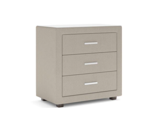 Элегантный комод отличается стильным дизайном и повышенным удобством. Три выдвижных ящика оснащены надёжными направляющими, обеспечивающими лёгкое открытие. Фасад ящиков и стенки комода покрыты обивочным материалом. Для удобства использования и продления срока эксплуатации, рекомендуется использовать стеклянную накладку. Накладка используется в качестве столешницы для комода и защищает его от повреждений и загрязнений.