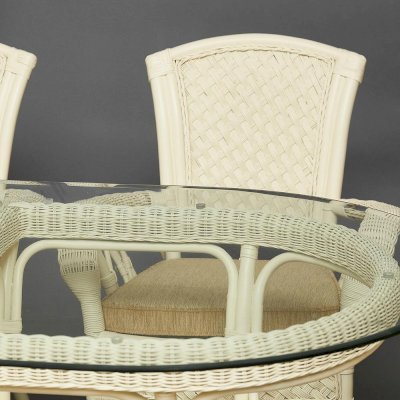 Элегантный обеденный комплект Secret De Maison ANDREA GRAND, состоящий из стола и шести кресел, выполнен вручную из натурального ротанга с использованием нескольких видов традиционного индонезийского плетения. Высокое качество и красота неповторимых плетеных узоров добавят благородства в ваш интерьер, подчеркнут вкус и статус своего владельца. Удобный стол, дополненный нижней полкой, со столешницей из закаленного стекла практичен и элегантен. Стекло обладает повышенной прочностью, долговечностью, способно многие годы не утрачивать своей первоначальной привлекательности. Удобные кресла с высокими подлокотниками и эргономичной спинкой обеспечат комфортную посадку для продолжительного отдыха. Тканевая обивка подушек проста в уходе, прослужит вам долгие годы, сохраняя свой первоначальный вид. Мебель покрыта прозрачным матовым лаком, устойчивым к УФ-излучению, она прочна, надежна, устойчива к повышенной влажности. Комплект идеально сочетается с мебелью из коллекции ANDREA, поставляется в собранном виде.