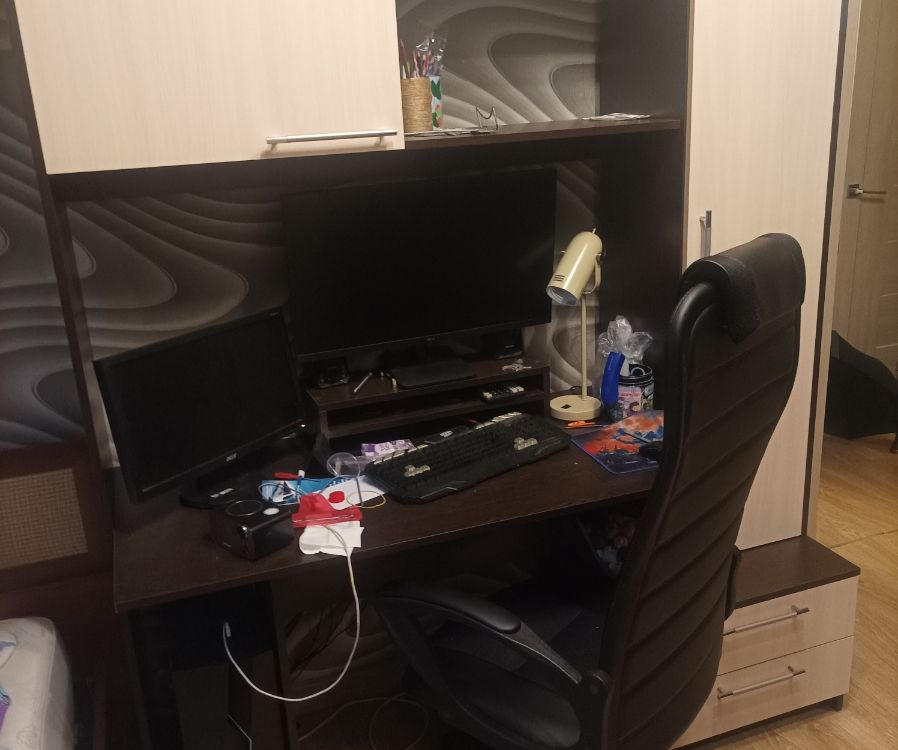В общем покупкой доволен по сравнению со старым угловым столом более компактный, столешница прям целоее рабочее место можно использовать под верстачек или парту для школьника, пришлось засверлить отверстие под кабеля чтоб не пускать их за стеной, доработаю край столешницы слишком острый угол, по сборке где то часа 3 ушло но без метра никуда, в комплекте есть все и даже подробная инструеция со всеми размерами деталей, короче отличный стол - шкаф!!!! И еще остается место небольгое за нижней перегородкой испольщую чтобы спрятать стабилизатор от детей...