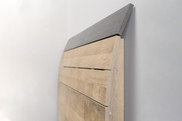 Планкованное изголовье с изгибом — два варианта конфигурации: с полкой и без неё. Кровать может быть оснащена ортопедическим основанием с подъёмным механизмом, который открывает доступ к вместительному коробу для хранения.
