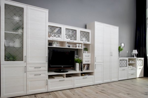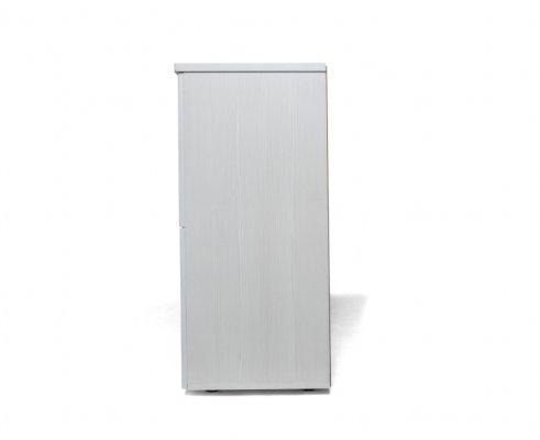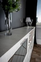 Дизайн комода функциональный и эстетичный. В конструкции все продумано до мелочей: есть два выдвижных ящика для небольших предметов, две открытые полки предназначены для предметов, которые хочется оставить на виду. Дверки со стеклом придают легкость. просторная столешница может послужить как для размещения телевизора, так и для любимых книг, статуэток и других аксессуаров.
