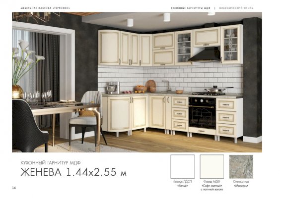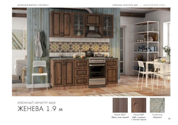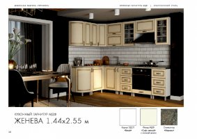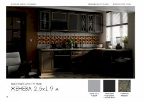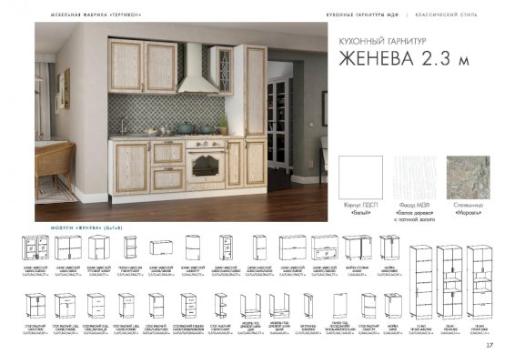 Кухонный гарнитур «Женева» превращает процесс приготовления пищи в настоящий праздник. В комплект входят все модули, необходимые для правильной организации пространства кухни. Удобная и красивая мебель вдохновляет человека на создание кулинарных шедевров. Изящные рисунки на стеклянных дверцах навесных шкафчиков наполняют классический стиль особым шармом.