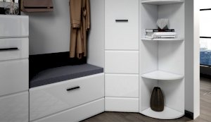 Угловой шкаф выполнен в современном стиле – сочетает в себе функциональность и эффектный внешний вид: строгая горизонтальная фрезеровка фасадов, ручки и задняя стенки контрастного черного цвета. Глянцевые белые фасады High Gloss из МДФ наполняют комнату светом, делают ее просторнее. Внутри предусмотрены секции для белья и отделение со штангой. Шкаф позволяет рационально использовать пространство и будет хорошо смотреться даже в небольшой комнате, служит связующим звеном для составления угловой системы хранения. Идеально компонуется со всеми модулями системы Йорк.