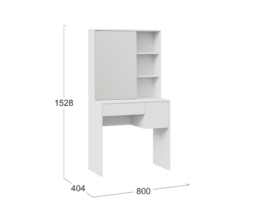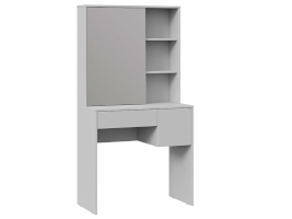 Помимо внешней привлекательности стол имеет большое зеркало, за которым размещены скрытые полки для хранения всех необходимых аксессуаров и косметики. Наличие открытых полок позволит установить предметы декора, а практичный выдвижной ящик и секция за распашной дверцей добавит места для необходимых мелочей. В этом туалетном столике нет ничего лишнего, только самое необходимое для уголка женской красоты.