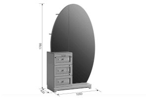 Состоит из: 3-х выдвижных ящиков, зеркала, стеллажа с полками, расположенным за зеркалом.