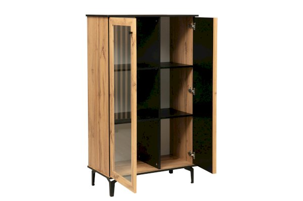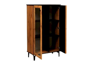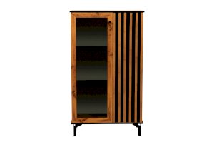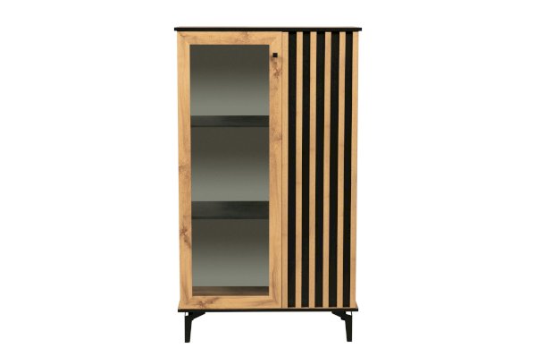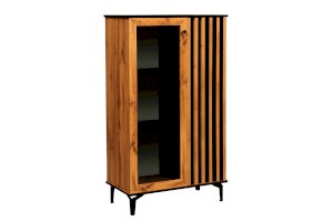 Шкаф визуально разделен на две части. В самом шкафу все просто – левое пространство за стеклом, правое – закрытое. Внутри – по три полки из ЛДСП. Каждая выдерживает вес до 5 кг. Стеклянная дверца обрамлена рамкой в цвет дерева, закрытая – с визитной карточкой коллекции – с реечным фасадом. Они разной ширины, так как левая часть, по традиции коллекции, шире, а правая – уже. За стеклом отлично смотрится посуда и сувениры, за закрытой дверцей – книги.