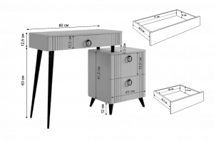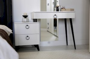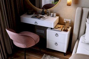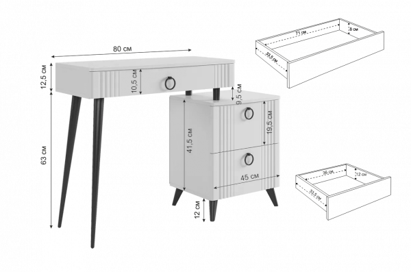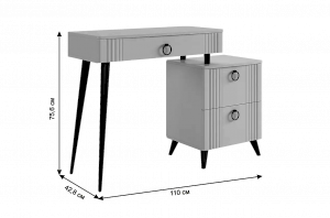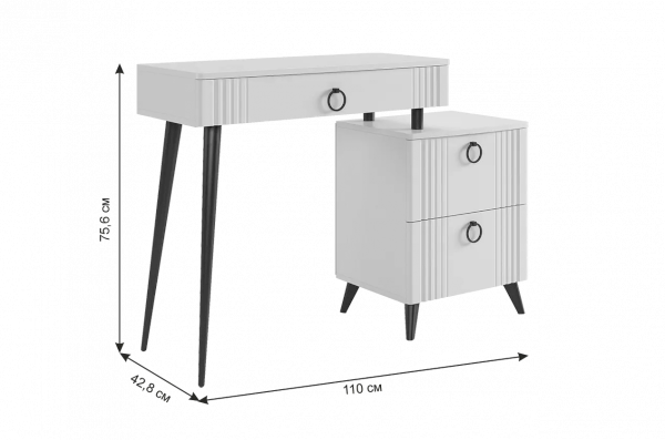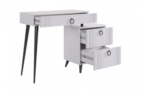 Туалетный столик  "Ева" прекрасно впишется в интерьер спальни или ванной комнаты благодаря своему стильному дизайну и функциональности. Вместительные выкатные ящики обеспечат удобное хранение косметики, украшений и других мелочей. Шариковые направляющие гарантируют легкость открывания и закрывания ящиков, а металлические ручки добавляют стильный акцент. Высокие черные опоры придают столику устойчивость и элегантность. Цветовое сочетание белого корпуса из ЛДСП и фасада из МДФ облицованного пленкой ПВХ создает свежий и модный образ мебели. Необычная фрезеровка фасада добавляет изысканности и утонченности этому туалетному столику.