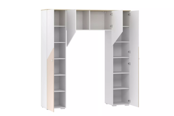 Шкаф комбинированный Банни представляет собой 2 шкафа для одежды соединённых между собой навесной полкой с двумя дверцами. Скругленные ручки-кнопки не имеют острых граней.