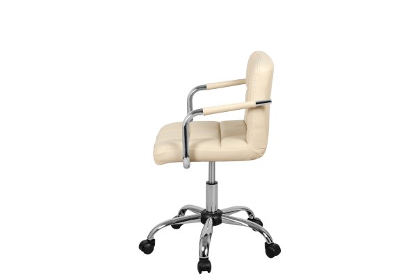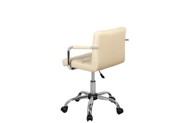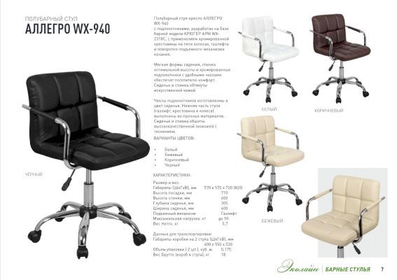 Полубарный стул-кресло АЛЛЕГРО WX-940 с подлокотниками, с применением крестовины на пяти колесах, газлифта и поворотно-подъемного механизма качания. Мягкие формы сидения, спинка оптимальной высоты и хромированные подлокотники с удобными чехлами обеспечат посетителю комфорт. Сиденье и спинка обтянуты искусственной кожей. Чехлы подлокотников изготовлены в цвет сиденья. Нижняя часть стула (газлифт, крестовина и колеса) выполнены из прочных материалов.