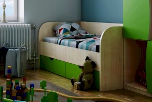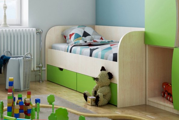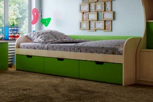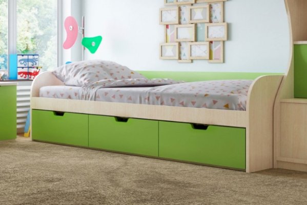 - Спальное место - 80х200 см: ДхГхВ 2.03x0.85x0.6 м. Под кроватью 3 ящика для белья.