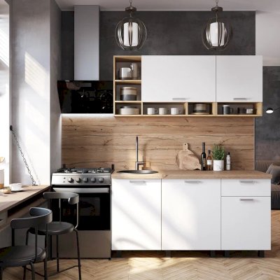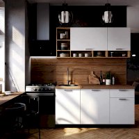 Кухня «Вика» - это не просто кухонный гарнитур, а единая концепция, объединяющая в себе стиль, компактность и вместительность. Белые фасады визуально увеличивают пространство и наполняют его светом. Верхняя часть кухни «Вика» представляет собой сочетание открытых и закрытых полок разного размера, которые подойдут для хранения кухонных девайсов и небольших предметов для готовки.
