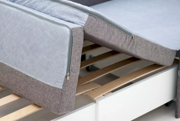 Ортопедическое основание, состоящее из 11 деревянных лат, выдержит нагрузку до 150кг. Подлокотники служат защитными бортиками во время сна. Нет острых углов, все детали мягкие.