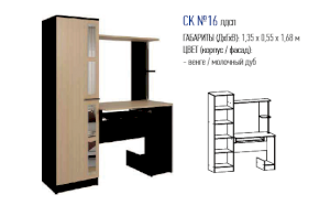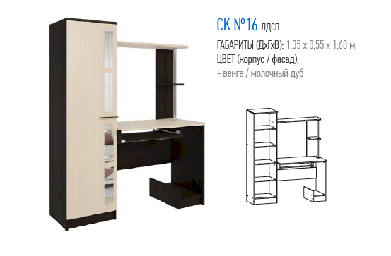 Купить стол компьютерный №16 следует тем, в чьем доме есть школьник, студент или просто человек, много времени проводящий перед монитором. Мебель создает для таких людей идеальные условия. Процессор и клавиатура не загромождают пространство, ведь для них предусмотрены специальные полочки. В шкафу-пенале и на открытой полке хватает места для хранения множества полезных, часто используемых вещей.