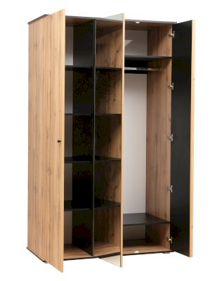 В этой модели – самое оптимальное распределение – как внешне, так и внутренне. Зеркальное полотно в центре очень функционально. Вы можете видеть себя в полный рост, и нет надобности вешать в комнате зеркало. За левой дверцей скрываются полки. Если шкаф стоит в спальне, они отлично подойдут для постельного белья или вещей, которые принято хранить в сложенном виде – свитера, поло, футболки, толстовки, джинсы и т.д. Каждая из полок выдерживает вес до 5 кг. Рядом, за двумя распашными дверцами, находится отделение для одежды на вешалках. И не только! Удобная полка-антресоль из ЛДСП сверху, еще одна полка внизу – здесь можно уместить многое! Металлическая штанга выдерживает вес до 20 кг.