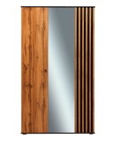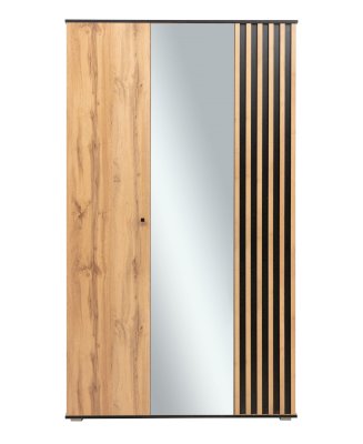 Дверцы шкафа разной ширины. Однотонное полотно гораздо шире, дверца с фасадной рейкой уже – она является основным акцентом и сразу обращает на себя внимание.