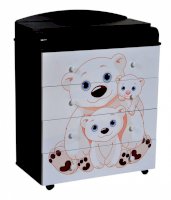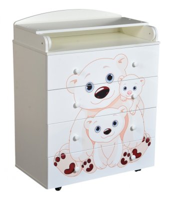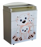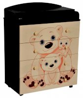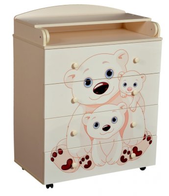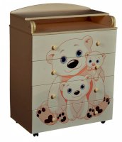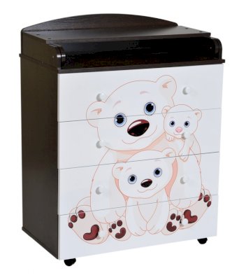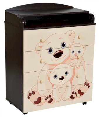 Венге/слоновая кость Пеленальный комод 800/4 Lilu 5 отличается привлекательным дизайном с использованием тематических детских принтов. В конструкции изделия предусмотрены 4 маленьких передвижных колеса, несколько вместительных ящичков на шариковых направляющих и откидывающаяся пеленальная столешница. Детский пеленальный комод, декорированный красочным рисунком, вмещает в себя постельные принадлежности, средства гигиены, распашонки, подгузники, игрушки, ползунки и другие личные вещи ребенка. Гладкая столешница идеально подходит для пеленания ребенка, а колесики позволяют быстро перемещать комод.