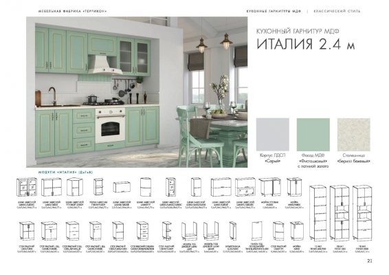 Кухня Италия изговаливается также в цветах белый/текстура платина+черная с патиной золото; серый/софт графит с патиной серебро; серый/фисташковый с патиной золото. Модули в этих цветовых решениях вы сможете найти в нашем интернет-магазине.