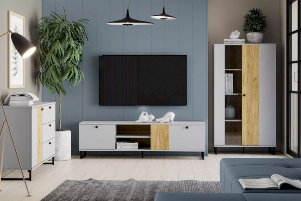 Коллекция БРУНО – это современный дизайн с характером, который отлично впишется в стиль лофт. Цвет платиново-серого и золотого дуба гармонично подчеркнут контрастными элементами – стеклом в витринах, черными ручками и черными металлическими опорами.