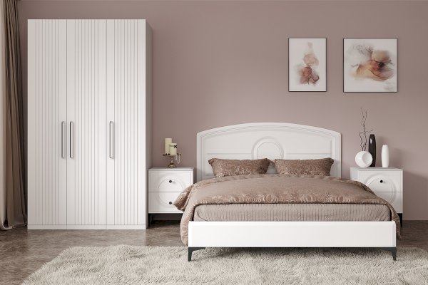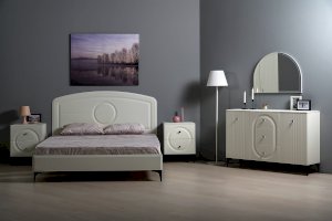 Вся лицевая фурнитура металлическая, графичное и стильное сочетание черного и хромированных деталей эффектно расставляет акценты на мебели. Основным декоративным элементом коллекции является круг, явно представленный фрезеровкой по фасадам тумбы.