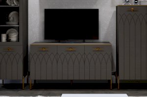 Большой комод на ножках с тремя отделениями для хранения – практичное решение для современной гостиной. Каждое отделение разделено полкой ЛДСП для хранения книг, журналов, предметов быта или домашнего текстиля. Благодаря ширине 1370 мм модуль может быть использован как комод под телевизор с большой диагональю.
