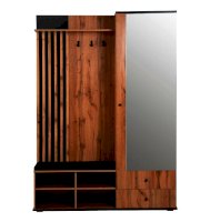 В шкафу есть открытая секция с тремя металлическими крючками, чтобы повесить верхнюю одежду. Ниже предусмотрен мягкий элемент, чтобы можно было присесть и снять обувь или просто поставить сумку. В закрытой секции - выдвижная штанга и шляпная полка. Выдвижная штанга выдерживает вес до 16 кг. Снизу предусмотрены два вместительных выдвижных ящика с шариковыми направляющими. Ящики можно использовать для хранения обуви и обувных аксессуаров.