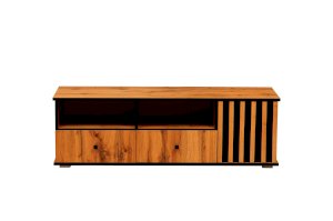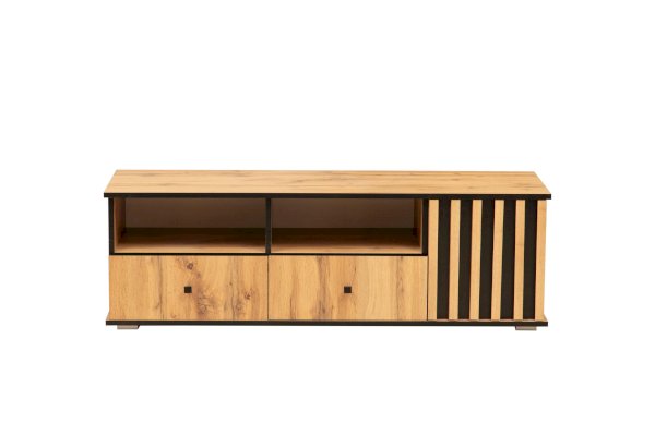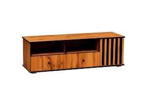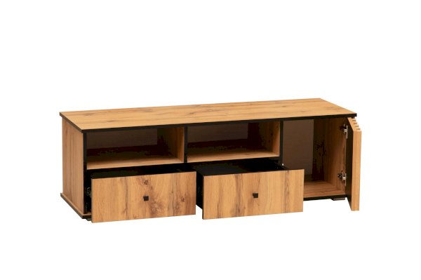 Даже если у вас нет ТВ, то тумба под ТВ должна быть обязательно! Ведь на нее можно поставить все, что захотите - большую плазменную панель, стереосистему или и то, и другое – габариты тумбы это позволяют! В дизайне поддерживается концепция асимметричности. Два отсека-близнеца: открытая полка и под ней выдвижной ящик плюс просторный ящик за распашной дверцей.